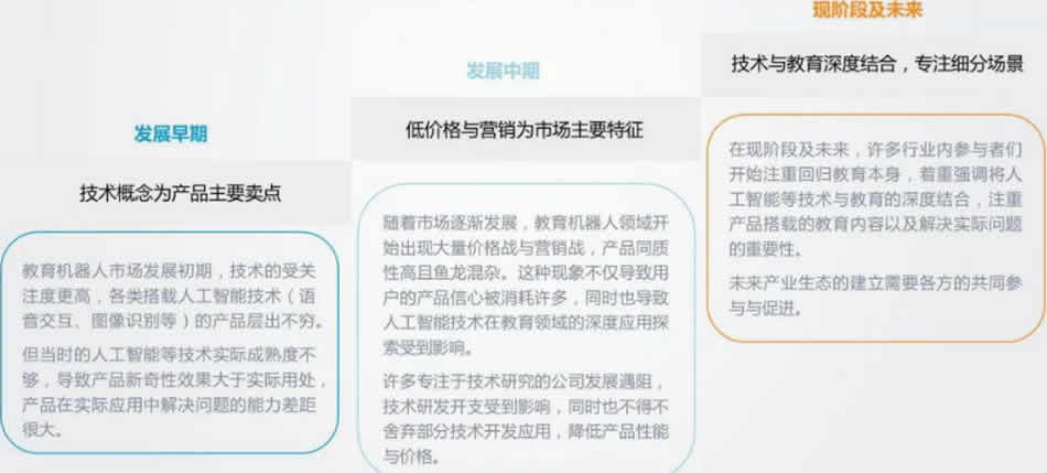 教育機器人經歷了從概念先行到價格營銷到回歸內容與價值本質的發展階段變遷。