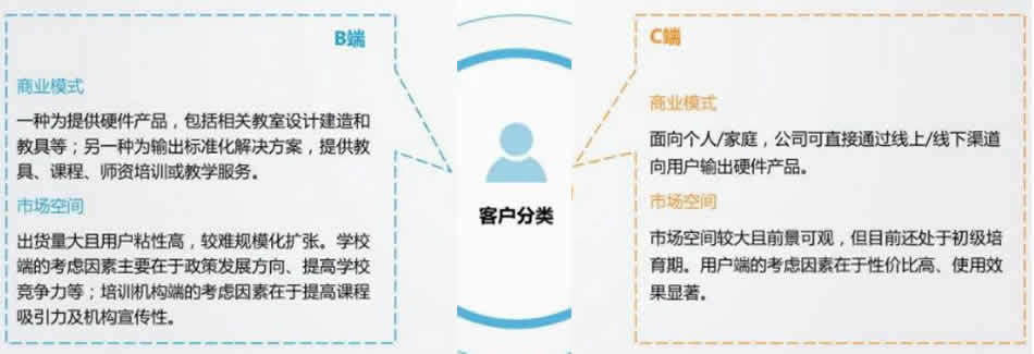 教育機器人的市場可分為TOB和TOC。其中在B端的主要客戶為學校和培訓機構(gòu),主要提供機器人的產(chǎn)品、課程、培訓等,由學校老師或機構(gòu)老師帶L學生學習;在C端則是主要針對家庭場景陪伴和方便孩子學習。