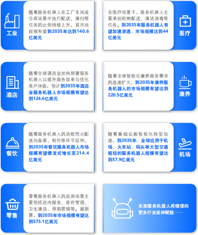 隨著服務機器人在工廠車間或 倉庫場景中執(zhí)行配送、清掃等 任務的比例持續(xù)上升 ,其市場規(guī)模有望到2035年達到140.6 億美元