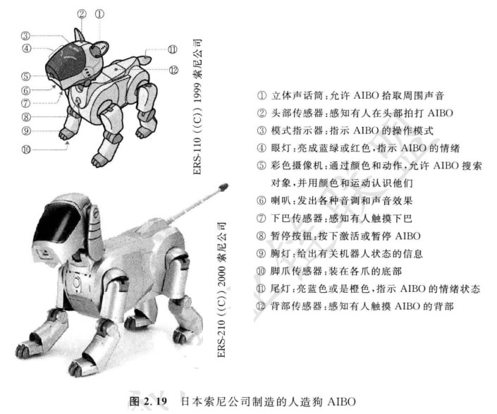 盡管四腿站立不動是無源穩定的,但要行走仍具有挑戰性。因為在步行期間,為 了保持穩定,機器人的重心需要主動地偏移。Z近,索尼投資數百萬美元開發一個叫作AIBO的四腿機器人(圖2.19)。為了制作這個機器人,索尼開發了近實時的新的 機器人操作系統和新的嚙合伺服電機。它具有足夠大的力矩以支持機器人,還是可 后向驅動的以保證安全。除了開發專用的電機和軟件之外,索尼公司還插入了一個 彩色視覺系統,使AIBO 能夠追逐一個色彩鮮艷的球。在需要再充電之前,機器人至 多能工作一個小時。該機器人初期銷量曾經很旺,D一年就賣了60000多臺。可是, 這臺機器狗所用的電機的數量和技術投資,使得它的售價高達約1500美元。