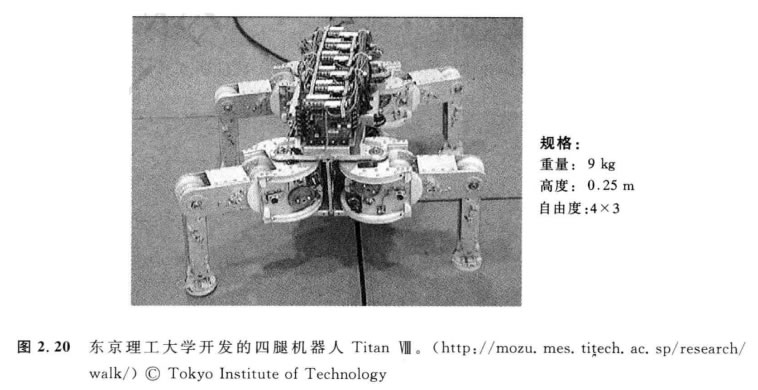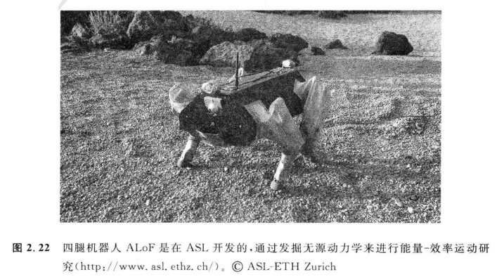 另一個四腿機器人的例子是ALoF, 該機器人是在ASL(蘇黎世瑞士聯邦理工大學)開 發的(圖2.22)。它被當作一個平臺,研究能量-效率運動。這是通過發掘無源動力學來進 行的,其方法如同2.2.2節所闡述的一樣,它在雙腳機器人中被證明是有效的。
