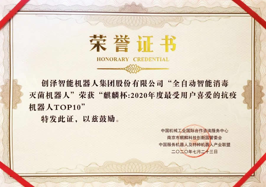 2020年7月23日,由機械工業國際合作咨詢服務中心、南京麒麟科創園管委會、服務機器人及特種機器人產業聯盟聯合主辦的2020第六屆國際服務機器人產業G峰論壇暨“第三屆麒麟杯頒獎典禮在南京舉行。此次典禮上,智能服務機器人L軍企業創澤集團被授予“麒麟杯:2020年度受用戶喜愛的抗疫機器人TOP10”榮譽證書。