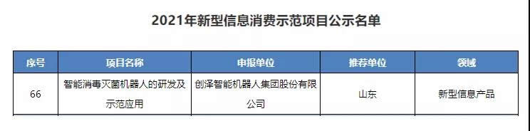 近日,工信部正式發(fā)布“2021年新型信息消費(fèi)示范項(xiàng)目公示名單”。創(chuàng)澤集團(tuán)的“智能消毒滅菌機(jī)器人的研發(fā)及示范應(yīng)用”項(xiàng)目,成功入選2021年新型信息消費(fèi)示范項(xiàng)目。