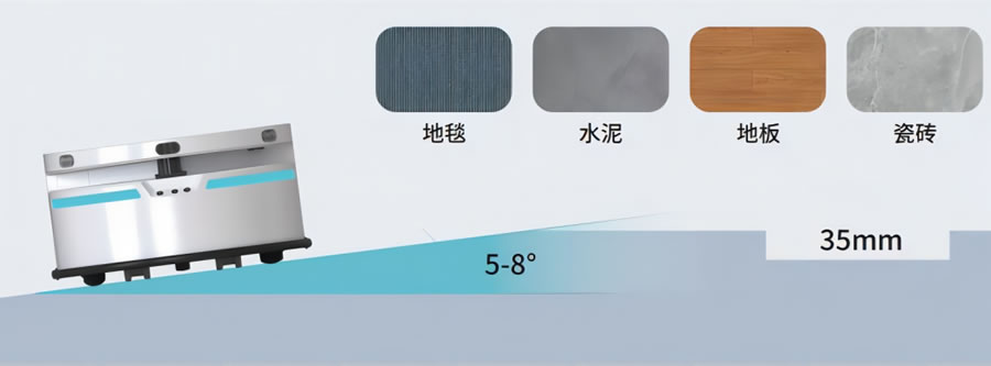 作為底盤界新星,創(chuàng)澤通用智能機(jī)器人底盤在負(fù)重、越障、爬坡性能方面同樣也表現(xiàn)優(yōu)異。除了在平地上擁有穩(wěn)定可靠的導(dǎo)航避障性能,在面對坡度、過坎這些障礙物時(shí),也擁有穩(wěn)定的行走性能,可以廣泛適用于地板、地毯、瓷磚、水泥等多種材質(zhì)地面,滿足J大部分場景應(yīng)用。