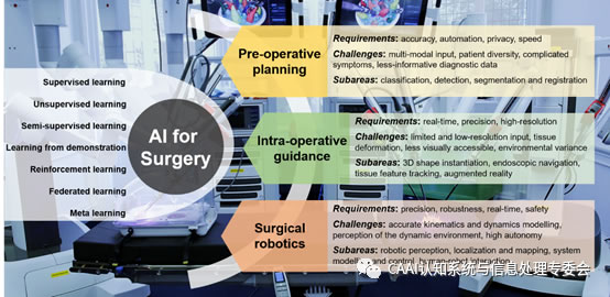 圖1:概述了流行的AI技術(shù),以及在術(shù)前規(guī)劃,術(shù)中指導(dǎo)和外科手術(shù)機(jī)器人學(xué)中使用的AI的關(guān)鍵要求,挑戰(zhàn)和子區(qū)域。