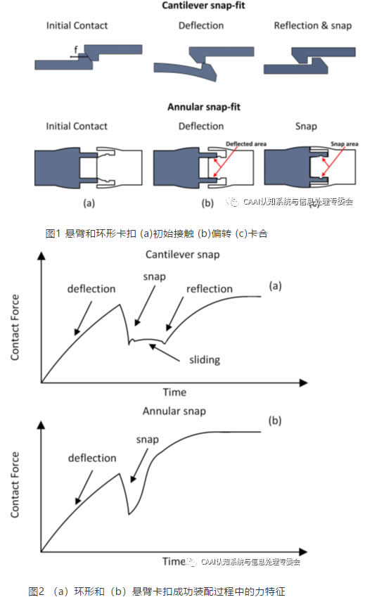 零件在不同的裝配階段產(chǎn)生的作用力可用于描述過程狀態(tài)。圖2所示的兩種卡扣的力特征圖具有不同的形狀,可用于及時識別裝配過程的完成情況。在這兩種情況下,物體的偏轉(zhuǎn)都會產(chǎn)生一個恒定的力,一旦部件的力消失,力就會急劇下降,當兩部分鎖定在一起時,力就會增大。懸臂卡扣在鎖定之前,兩個部件相互滑動,產(chǎn)生一個恒定的摩擦力,該摩擦力由于部件的材質(zhì)屬性造成的力載荷不同而變化。環(huán)形卡扣則不存在滑動。力信號的確切形狀取決于連接部件的機械性能和卡扣類型。環(huán)形和懸臂是兩個J端情況,環(huán)形卡扣是在恒定的力載荷下,而懸臂卡扣在咬合后載荷消失。