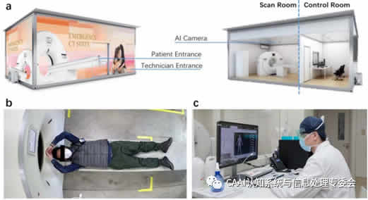 人工智能成像工作流程:許多現(xiàn)代的X光和CT系統(tǒng)都配備了用于病人監(jiān)護(hù)的攝像機(jī)。在COVID-19爆發(fā)期間,這些設(shè)備促進(jìn)了非接觸掃描工作流程的實(shí)施。技術(shù)人員可以通過攝像機(jī)的實(shí)時(shí)視頻流從控制室監(jiān)控病人。在這種情況下,人工智能能夠通過從視覺傳感器獲取的數(shù)據(jù)中識(shí)別患者的姿勢和形狀來自動(dòng)執(zhí)行操作,以確定佳掃描參數(shù)。這樣的自動(dòng)化工作流程可以顯著提G掃描效率并減少不必要的輻射暴露。一個(gè)顯著的例子是基于由可視人工智能技術(shù)支持的移動(dòng)CT平臺(tái)自動(dòng)掃描工作流,如圖1(a)所示。移動(dòng)平臺(tái)完全獨(dú)立,帶有基于人工智能的預(yù)掃描和診斷系統(tǒng)。它被重新設(shè)計(jì)成一個(gè)完全隔離的掃描室和控制室,以避免技術(shù)人員和患者之間不必要的互動(dòng)。進(jìn)入掃描室后,通過視覺和聽覺提示,指示患者在病床上擺好姿勢(圖1(b))。技術(shù)人員可以通過窗戶觀察,也可以通過掃描室內(nèi)安裝在天花板上的人工智能攝像機(jī)傳輸?shù)膶?shí)時(shí)視頻,并在必要時(shí)校正病人的姿勢(圖1(c))。患者定位算法將從用照相機(jī)[1]捕獲的圖像中自動(dòng)恢復(fù)患者的3D姿態(tài)和完全重建的網(wǎng)格。基于3D網(wǎng)格,患者目標(biāo)身體部分的掃描范圍和3D中心線都被估計(jì)并轉(zhuǎn)換成控制信號(hào)和優(yōu)化的掃描參數(shù),以供技術(shù)人員驗(yàn)證。一旦核實(shí),病床將自動(dòng)對(duì)準(zhǔn)ISO中心,并移入掃描架進(jìn)行掃描。采集到CT圖像后,將對(duì)其進(jìn)行處理和分析,以便進(jìn)行篩查和診斷。2、AI圖像增強(qiáng)在COVID-19中的具體應(yīng)用