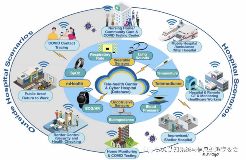 圖1 可穿戴設備在不引人注目的傳感器和遠程保健系統在流行病期間的應用場景(上面的一些原始設計概念是從R.Pettigrew博士2012年在國家科學院舉行的IEEE生命科學大挑戰會議上的演示中借用的)[1]
