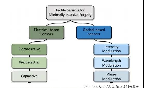 應(yīng)用于MIS的觸覺傳感器主要是基于電學(xué)或光學(xué)原理開發(fā)的。圖1顯示了基于傳感原理的MIS觸覺傳感器的種類。