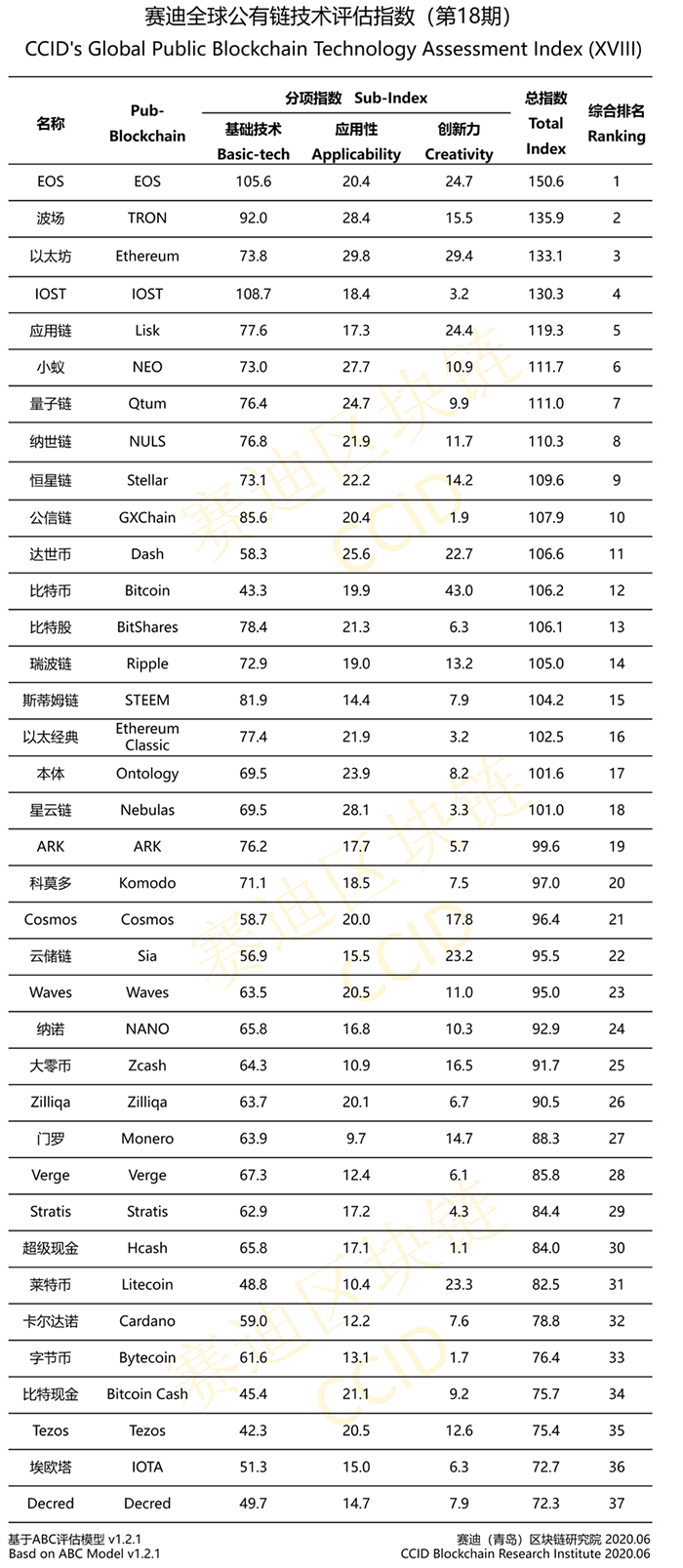 2020年6月18日,中國電子信息產(chǎn)業(yè)發(fā)展研究院(賽迪研究院)發(fā)布第18期賽迪公有鏈技術(shù)評估指數(shù),對37條知名公有鏈從技術(shù)維度進(jìn)行綜合考量并給出排名。