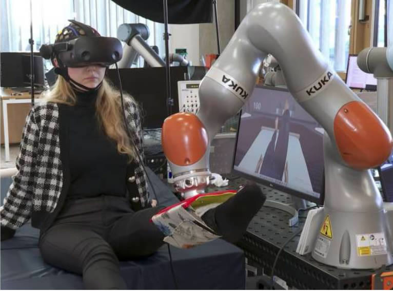中風后的患者,以及在某種程度上經(jīng)歷過脊髓創(chuàng)傷的患者經(jīng)常需要進行康復訓練,試圖重新連接大腦中移動患肢的意圖和實際的肌肉運動。該研究團隊設(shè)計了一個集以下所有功能于一身的訓練系統(tǒng):一個虛擬現(xiàn)實耳機,它能促使患者朝著虛擬目標發(fā)起腿部運動,并產(chǎn)生獨立運動的錯覺;一個神經(jīng)接口,它能記錄患者的運動意圖;一個機器人,由于我們自己的軟件,它能以自然的方式移動腿部和脊髓的經(jīng)皮電刺激,粗略地說,這會放大來自大腦的信號。