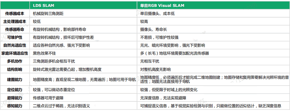 LDS SLAM 與 VSLAM 各有優劣,二者相容或成為行業主流發展方向之一。對比 LDS SLAM 技術與單目 VSLAM 技術,其中 LDS SLAM 技術可視范圍廣(VSLAM 只有50-60度),環境適應性更強,地圖精度更G,同時能夠獲取深度信息,可以應用于避障;而VSLAM技術成本更低,攝像頭的壽命長、不易損、不增加機身G度,同時能夠捕捉語義信息,提升地圖分區精度。