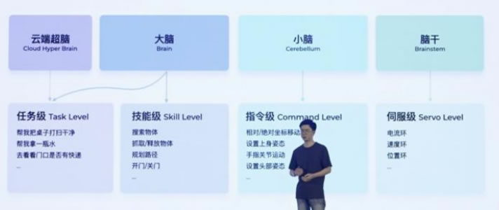 “小腦”負(fù)責(zé)產(chǎn)生運(yùn)動(dòng)控制指令生成,比如設(shè)置上身姿態(tài)、控制指關(guān)節(jié)運(yùn)動(dòng)、控制頭部姿勢(shì)等,涉及運(yùn)動(dòng)學(xué)、動(dòng)力學(xué);另外“腦干”這一層級(jí)主要是解決底層的運(yùn)動(dòng)控制能力問(wèn)題,比如所有電