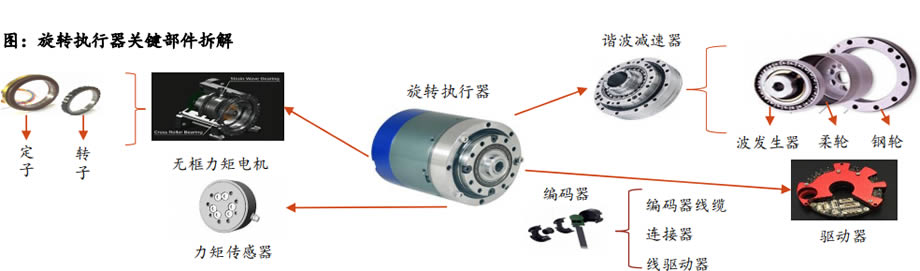 旋轉(zhuǎn)執(zhí)行器:驅(qū)動關(guān)節(jié)完成旋轉(zhuǎn)動作,減速器為核心部件