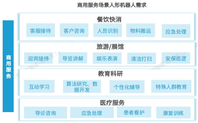 人形機(jī)器人的互動能力使其在商用服務(wù)中具有較好的應(yīng)用前景, 人形機(jī)器人可以支持現(xiàn)實(shí)空間中的學(xué)習(xí),用面部表情、肢體語言、聲音和 語音與人類交流,使互動更具吸引力,也可以通過編程來促進(jìn)機(jī)器人與人類的互動 , 目前展覽講解及科研場景已經(jīng)落地。家用場景以非標(biāo)準(zhǔn)化場 景為主,人形機(jī)器人技術(shù)很難應(yīng)對G隨機(jī)性和復(fù)雜性的家用任務(wù),目前普遍方案只是在局部小范圍的可控條件下實(shí)現(xiàn)少量復(fù)雜任務(wù),還尚需技術(shù) 持續(xù)發(fā)展。