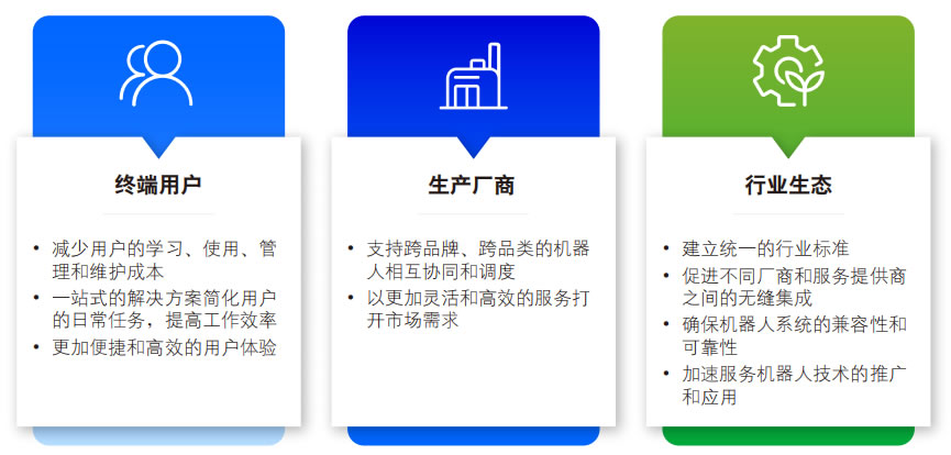對于廠商來說,開放性的全棧式智能服務機器人生態提供了機器人之間的相互協同和調度的能力。這種協同能力使得不同廠商的、不同類 型的機器人可以在同一個環境中協同工作,完 成更復雜的任務。開放性的全棧式智能服務機 器人生態提供了一個平臺,多類型機器人可自 主優化作業路徑、規避沖突并形成任務閉環, 顯著提升復雜場景下的整體服務效率。使得機 器人能夠作為一個整體系統協同工作,提供更 加靈活和高效的服務。對廠商而言,這種生態 化協作將推動行業從單一產品競爭轉向多品類 產品矩陣的生態建設。