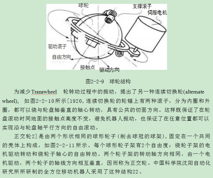 球 輪(ball wheel)由一個滾動球體、 一組支撐滾子和一組驅動滾子組成,其中 支撐滾子固定在車底盤上,驅動滾子固定在一個可以繞球體中心轉動的支架上,如 圖2-2-9所示15.16]。每個球輪上的驅動滾子由一個電機驅動,使球輪繞驅動滾子 所構成平面的法線轉動,同時可以繞垂直的軸線自由轉動。輪子的驅動力是滾子 和輪子的摩擦力,使得輪子的驅動力和速度受到限制,這也是球輪的缺點。同時, 輪子在地面滾動過程中吸附的一些灰塵,會在輪子和滾子的接觸點積累,影響兩者 之間的摩擦力,使輪子打滑,我們在使用滾動鼠標時都會有同樣的感受。因而,對 球輪的改進方法是有效增加滾子和球體之間的摩擦驅動力。