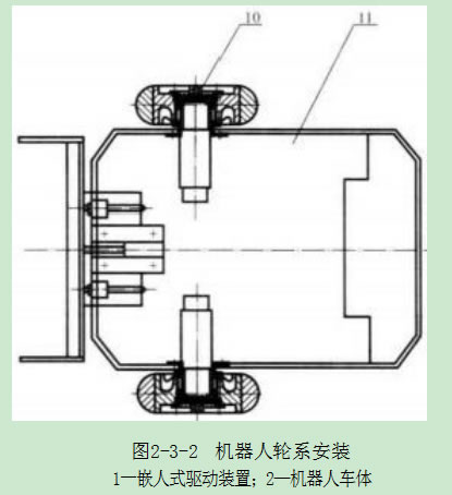 在該裝置中選用帶調(diào)速功能的直流電機作為動力,電機轉動時由電機軸直接 帶動,電機驅(qū)動法蘭盤與車輪緊固連接,繼而驅(qū)動車輪,實現(xiàn)直接驅(qū)動,車輪與電機 之間同步旋轉,無任何變速環(huán)節(jié)和嚙合環(huán)節(jié),避免了累計回轉誤差和可能的打滑。 機器人車體上安裝左右兩個驅(qū)動裝置,通過對電機轉速的調(diào)節(jié)來控制車輪轉速和 回轉方向的變化,使機器人實現(xiàn)雙輪差動運動,走直線、圓弧甚至更復雜的運動。 橡膠車輪與電機安裝套間采用一對推力球軸承作為回轉副,軸承與電機安裝套。 外圈與橡膠車輪均為緊配合,兩軸承間以止推環(huán)和擋圈保持間距,軸承與電機安裝 套間通過軸承止推法蘭盤和電機安裝套的凸臺限位,保證整體機構的穩(wěn)定和配合的緊密。整套裝置中,電機安裝套、電機驅(qū)動法蘭盤、軸承止推法蘭盤以及相應連 接件推力球軸承、止推環(huán)、擋圈全部嵌入橡膠車輪中,配合緊密,同時起到車輪軸的 作用. 由于該結構短而粗,所以剛度強度相當大,能夠承受很強的沖擊。并且選用 的驅(qū)動電機嵌入電機安裝套,機器人對抗時車輪承受的沖擊由與車輪緊密配合的 電機安裝套等部件直接承受,避免了電機直接承受沖擊,起到緩沖作用。以上共同 構成雙重嵌入式結構,結構精簡、體積小,穩(wěn)定性高和緊密度高。嵌入式直接驅(qū)動 裝置如圖2-3-1所示,機器人輪系安裝如圖2-3-2所示。