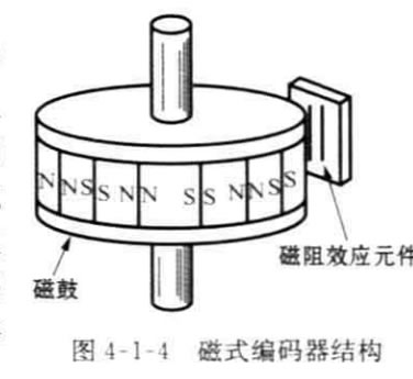 磁式編碼器是通過在強磁性材料表面上等 間隔的磁化刻度標尺,標尺旁邊相對放置磁阻 效應元件或霍爾元件,即能檢測磁通的變化,如 圖4-1-4所示,兩個磁傳感器的距離恰好是磁化 標尺間隔的1/4. 因此可以根據輸出信號的相位 關系檢測旋轉方向。與光學編碼器相比,磁式編 碼器的刻度間隔大,但它具有耐油污、抗沖擊等 特點。
