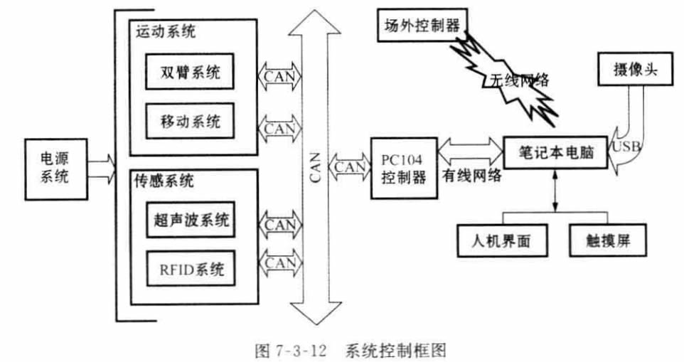 迎賓服務機器人系統各硬件模塊主要由CAN 總線連接,通過統一的CAN 總 線協議將各模塊簡單地加載到系統中。系統主要由電源系統、運動控制系統、傳感 系統等組成,其中運動控制系統包括雙臂系統及移動系統,傳感器系統包括超聲波系統、RFID定位系統、視覺系統組成。