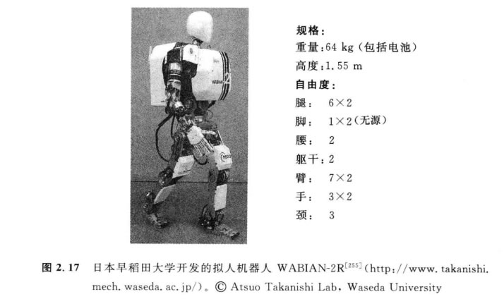 雙腳機器人一個重要的特征是它們具有類似人的外形。它們可以被制造成和人 相近似的尺寸,這使得它們在人機交互的研究中成為出色的運載工具。日本早稻田 大學制造的WABIAN-2R (圖2.17)正是作這種研究的[255]。WABIAN-2R 被設計 成能夠模仿人的運動 , 并甚至設計成能夠像人一樣跳舞 。