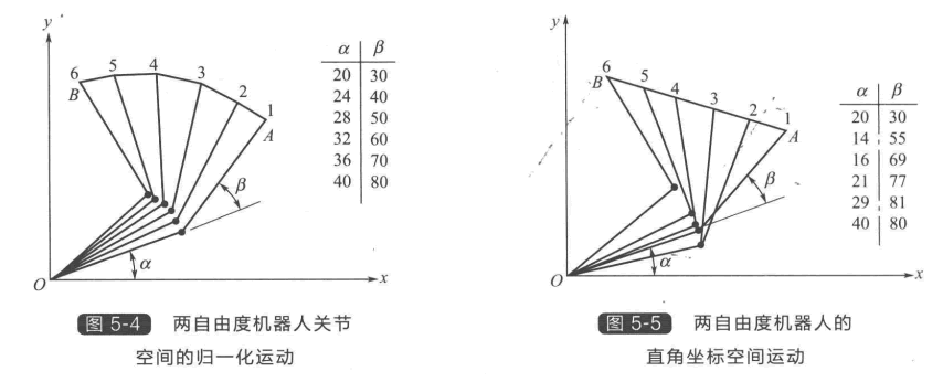 以兩自由度機器人為例,介紹在關節空間和在直角坐標空間進行軌跡規劃的基本原理。如圖5-3所示,要求機器人從A 點運動到B 點。機器人在A 點時的關節角為α=20°, β=30°。假設已算出機器人達到B 點時的關節角是α=40°,β=80°,同時已知機器人兩個關 節運動的Z大速率均為10°/s 。機器人從A 點運動到B 點的一種方法是使所有關節都以其Z大角速度運動,這就是說,機器人下方的連桿用2s 即可完成運動,而如圖5-3所示,上方的連桿還需 再運動3s 。 圖5-3中畫出了操作臂末端的軌跡,可 見其路徑是不規則的,操作臂末端走過的距離也是 不均勻的。