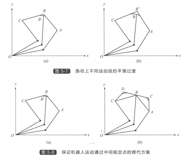 還有一種情況是軌跡規劃的路徑并非直線,而 是某個期望路徑(例如二次曲線),這時需要基于 期望路徑計算出每一段的坐標,并進而計算相應的 關節量才能實現沿循期望路徑運動。至此只考慮了 機器人在 A 、B 兩點間的運動,而在多數情況下, 可能要求機器人順序通過許多點。下面進一步討論 多點間的軌跡規劃,并Z終實現連續運動。 圖5-6具有加速和減速段的軌跡規劃 如圖5-7所示,假設機器人從A 點經過B 點運 動到C 點。一種方法是從A 向B 先加速,再勻速,接近B 時減速并在到達B 時停止,然后 由 B 到C 重復這一個過程。這一停一走的不平穩運動包含了不必要的停止動作。一種可行 方法是將B 點兩邊的運動進行平滑過渡。機器人先抵達B 點(如果必要的話可以減速),然 后沿著平滑過渡的路徑重新加速,Z終抵達并停在C 點。平滑過渡的路徑使機器人的運動 更加平穩,降低了機器人的應力水平,并且減少了能量消耗。如果機器人的運動由許多段組 成,所有的中間運動段都可以采用過渡的方式平滑連接在一起。但需要注意由于采用了平滑 過渡曲線,機器人經過的可能不是原來的B 點而是B'點[如圖5-7(a) 所示]。如果要求機 器人準確經過B 點,可事先設定一個不同的B"點,使得平滑過渡曲線正好經過B 點[如圖 5-7(b) 所示]。另一種方法如圖5-8所示,在B 點前后各加過渡點D 和E, 使 得B 點落在 DE 連線上,確保機器人能夠經過 B 點 。