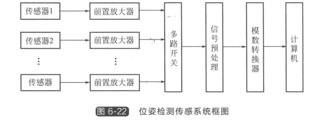 ④電渦流位姿檢測傳感系統。電渦流位姿檢測傳感系統是通過確定由傳感器構成的測 量坐標系和測量體坐標系之間的相對坐標變換關系來確定位姿。當測量體安裝在機器人末端 執行器上時,通過比較測量體的相對位姿參數的變化量,可完成對機器人的重復位姿精度檢 測。圖6-22所示為位姿檢測傳感系統框圖。檢測信號經過濾波、放大、 A/D 變換送入計算機進行數據處理,計算出位姿參數。