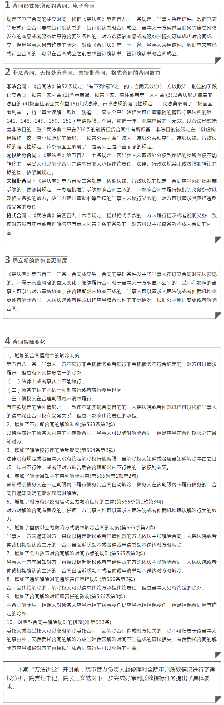 法官助理李洋通過對比民法典《合同編》與現(xiàn)行《中華人民共和國合同法》等新舊法律條文,解讀了《民法典》編纂中對原《合同法》訂立規(guī)則相關(guān)法條的完善和創(chuàng)新之處,并歸納總結(jié)出九大重大變化,為參會人員理解民法典合同編內(nèi)容提供了理論支撐和觀點(diǎn)參考。