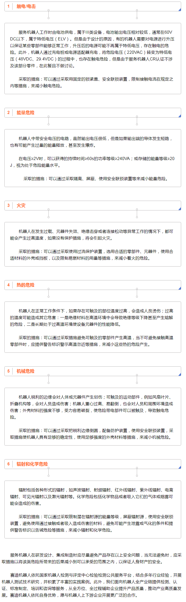 GB 4943.1-2011涵蓋的服務機器人潛在危險有:電擊、與能量有關的危險、著火、與熱有關的危險、機械危險、輻射、化學危險等。不同的服務機器人,由于設計和使用場所的不同,各自潛在的主要危險類型不一樣,需要根據實際情況進行判斷。