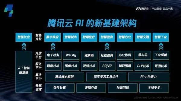 基于騰訊云、企業微信等社交連接工具,騰訊布局AI新基建全景。騰訊云AI新基建整體布局為“一云三平臺”架構。一云是騰訊云,三平臺包括算法平臺、服務平臺以及開放平臺。