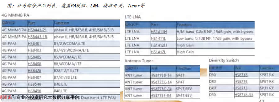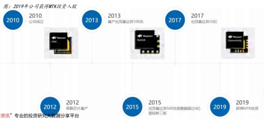 公司以射頻開關(guān)、LNA芯片起家,實(shí)現(xiàn) L先手機(jī)品牌如三星、小米、華為、vivo、OPPO等重點(diǎn)客戶覆蓋,并在2019年實(shí)現(xiàn)射 頻模組產(chǎn)品從無到有的突破。在細(xì)分產(chǎn)品中,比較優(yōu)勢(shì)明顯,射頻開關(guān)已通過G通的小批 量試產(chǎn)驗(yàn)證,正式進(jìn)入量產(chǎn)。DiFEM的成功研制是公司技術(shù)創(chuàng)新的又一里程 碑,打破了海外寡頭在射頻模組L域的壟斷局勢(shì)。站在當(dāng)前時(shí)點(diǎn),公司營收體量小,所處 賽道面向250億美元市場,具備5G換機(jī)潮和射頻芯片國產(chǎn)替代的雙重彈性。