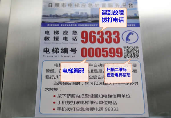 平臺對錄入的每臺電梯都進行了準確定位,并且在轎廂內張貼標識牌,標識牌上有電梯應急救援電話“96333”以及每臺電梯對應的編號。市民乘坐電梯偶遇故障被困時,可撥打“96333”救援熱線電話,告知接線人員電梯編碼,即可對所乘電梯的所在小區、單元樓實施迅速定位,安排專業人員前去救援。市民在日常乘梯時也可憑借96333應急處置平臺的數據歸集,掃描標識牌二維碼,獲知電梯檢驗、維保、投保、管理等情況,參與電梯安全管理社會共治。