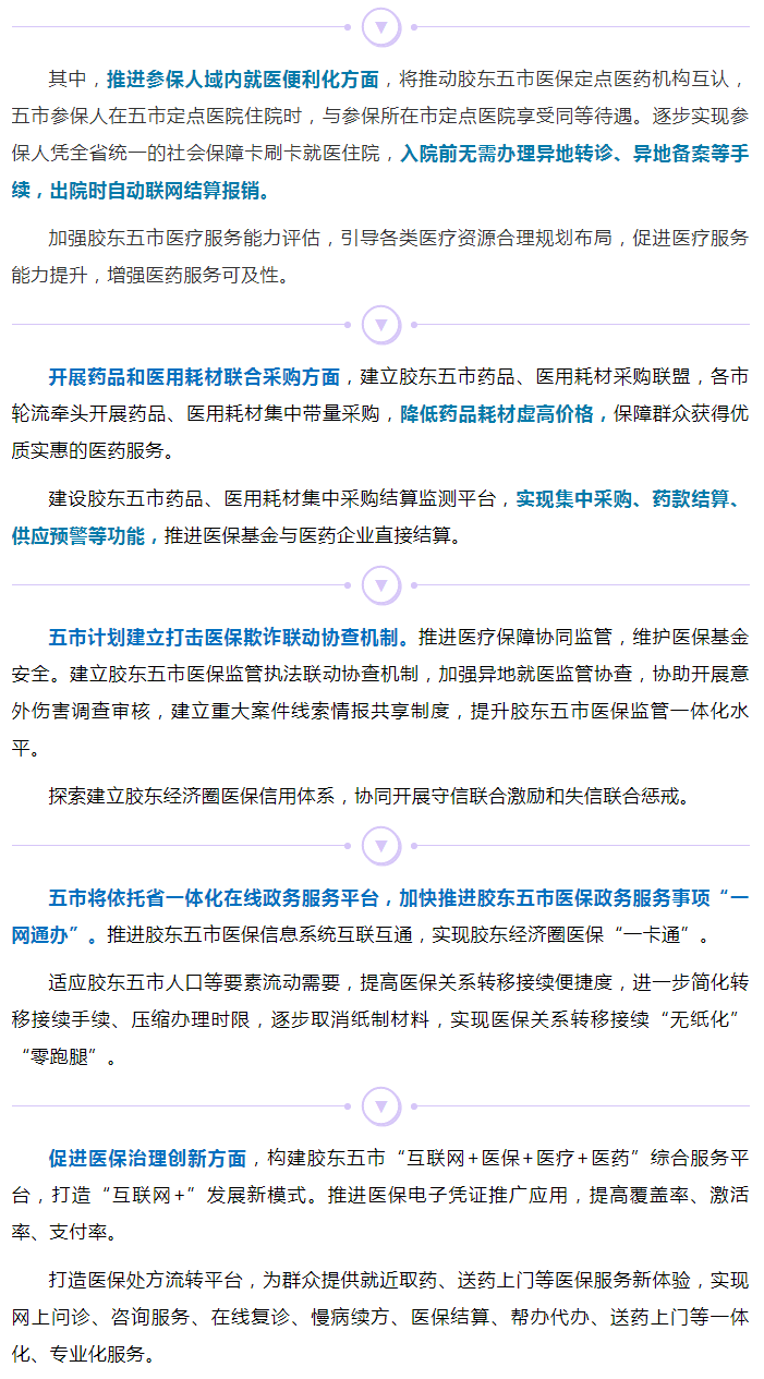 膠東五市構建醫保發展共同體,將重點推進參保人域內就醫便利化、開展藥品和醫用耗材聯合采購、支持G新醫藥產業發展、建立打擊醫保欺詐聯動協查機制、加快醫保信息互通共享、促進醫保治理創新等六個方面的工作。