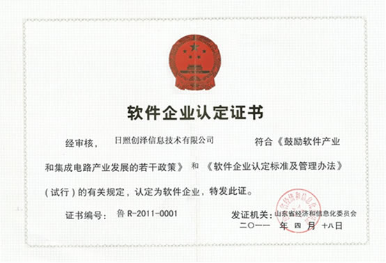 于二零一一年四月十八日通過山東省經濟和信息化委員化審核,符合《鼓勵軟件產業和集成電路產業發展的若干政策》和《軟件企業認定標準和管理辦法》有關規定,被認定為軟件企業。