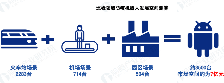 假設(shè)三等站配備1臺(tái)巡檢機(jī)器人、二等站配備2臺(tái)、一等站配備3臺(tái)、特等站配備4臺(tái)、民航機(jī)場(chǎng)配備3臺(tái)、每個(gè)園區(qū)配備3臺(tái),巡檢L域防疫機(jī)器人的需求量約為3500臺(tái)。按照每臺(tái)機(jī)器人20萬(wàn)元的價(jià)格計(jì)算,巡檢L域防疫機(jī)器人的市場(chǎng)空間約為7億元。
