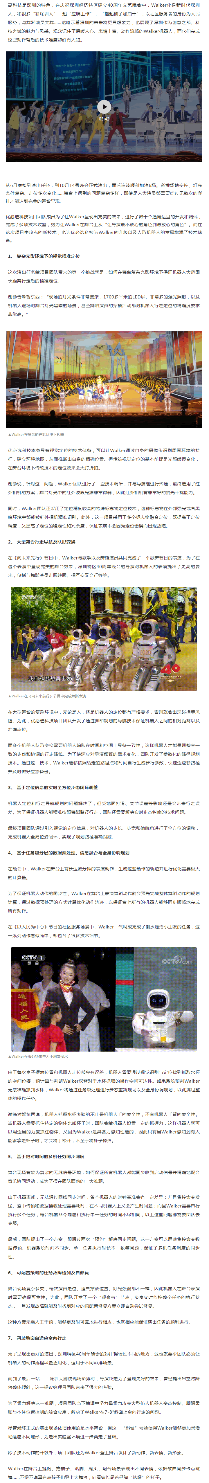 近日,“逐夢·先行——慶祝深圳經濟特區建立40周年文藝晚會”(以下簡稱深圳特區40周年晚會)在深圳大劇院圓滿落下帷幕,在這場總時長100分鐘的晚會中,除了展現深圳一路先行先試、開拓前行的歷程外,還有誕生在新時代的“深圳人”Walker機器人的活力亮相。
