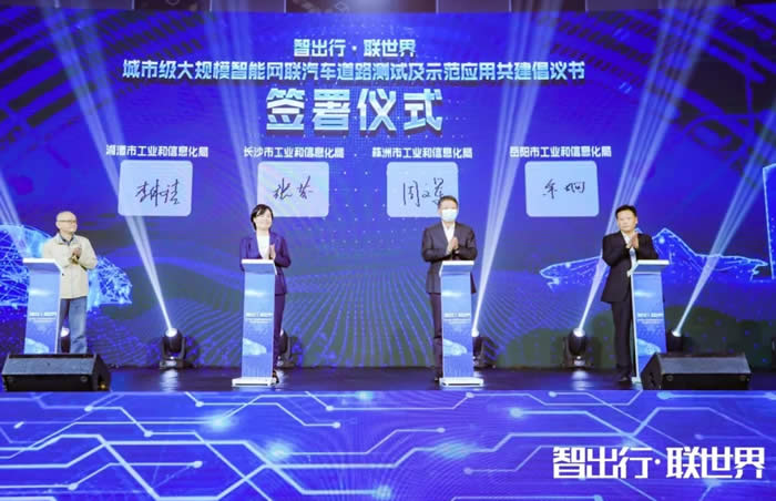 長沙市、株洲市、湘潭市、岳陽市工業(yè)和信息化局共同簽署了《城市級大規(guī)模智能網(wǎng)聯(lián)汽車道路測試及示范應(yīng)用共建倡議書》。