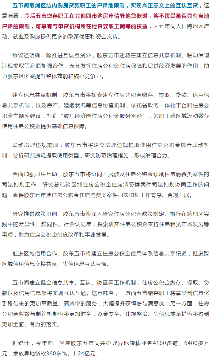 根據(jù)協(xié)議,膠東五市住房公積金部門(mén)將深入推進(jìn)互認(rèn)互貸,推動(dòng)住房公積金轉(zhuǎn)移接續(xù)和繳存信息互認(rèn),在尊重五市具體政策措施的基礎(chǔ)上,取消區(qū)域內(nèi)購(gòu)房貸款職工戶籍地限制,確保申請(qǐng)異地貸款的職工與申貸機(jī)構(gòu)所在地貸款職工享有同等權(quán)益。