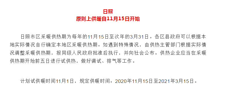 日照主城區試供熱,11月15日起達標供熱,供熱時間為11月15日至次年的3月31日,
