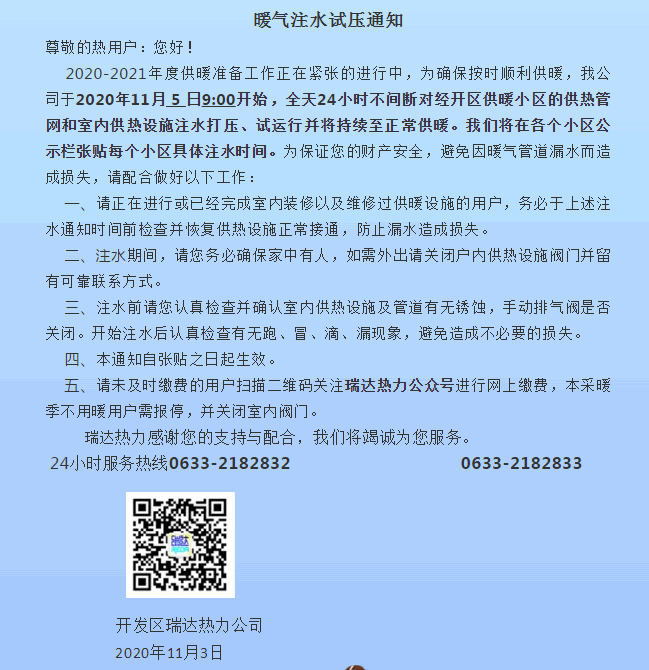 計劃試供暖時間11月1日,規定供暖時間:2020年11月15日至2021年3月15日。