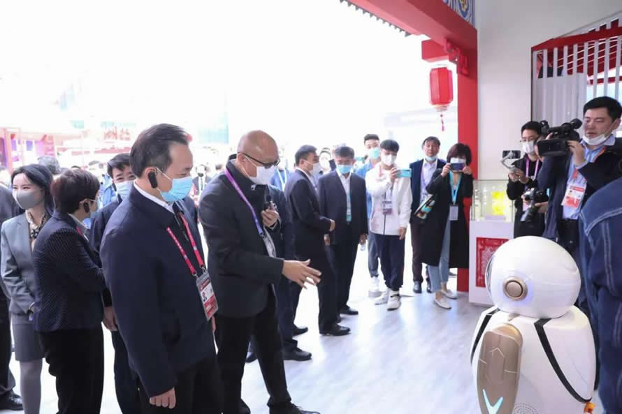 2020年11月5日,山東省委副書記、省長李干杰等L導在進博會巡展時,智能迎賓講解機器人“創創”在廣場“至誠山東”展區熱情接待了李干杰省長一行。