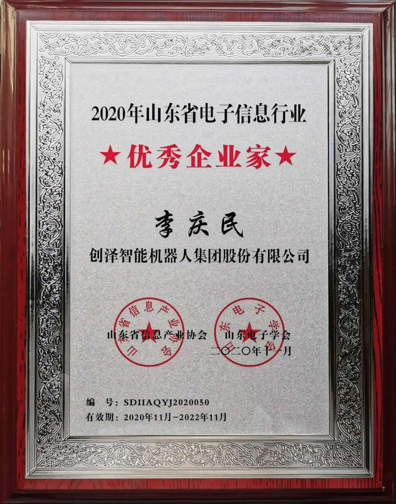 評審專家從工作經(jīng)歷、榮譽(yù)資質(zhì)、企業(yè)經(jīng)營等方面進(jìn)行初審、復(fù)審后,創(chuàng)澤集團(tuán)董事長李慶民榮獲“山東省電子信息行業(yè)優(yōu)秀企業(yè)家”榮譽(yù)稱號。