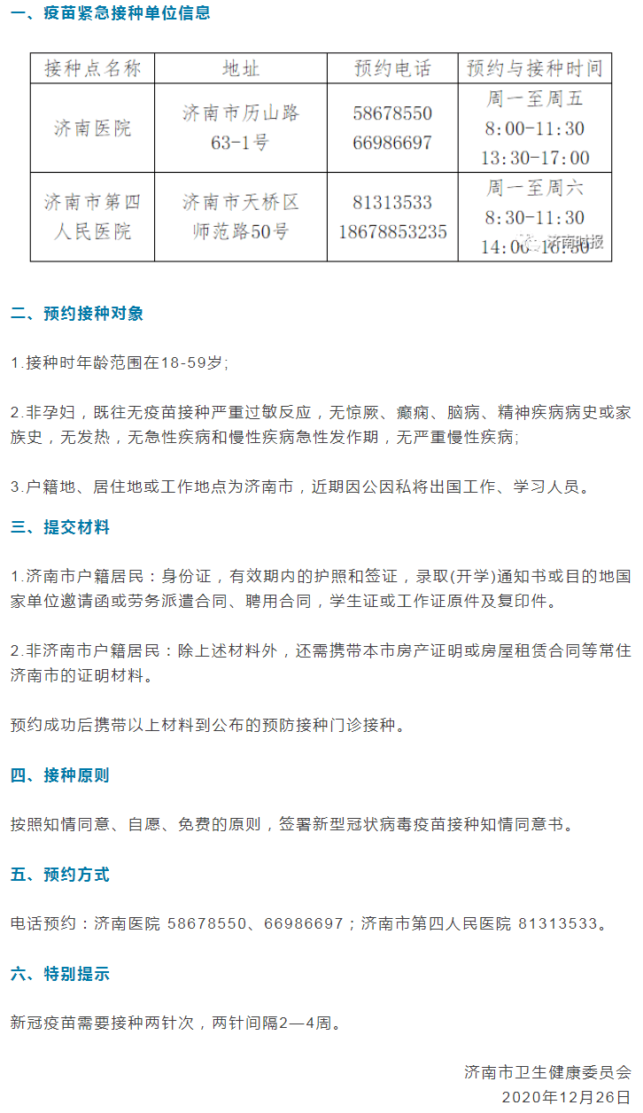 濟南新G疫苗接種點電話,濟南醫院 58678550、66986697;濟南市第四人民醫院 81313533,濟南市衛生健康委員會
