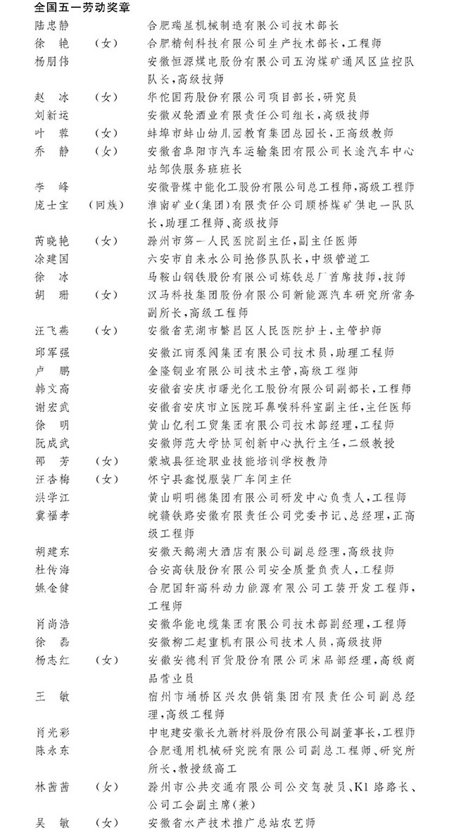 > 2021年安徽省全國五一勞動(dòng)獎(jiǎng)?wù)芦@得者名單