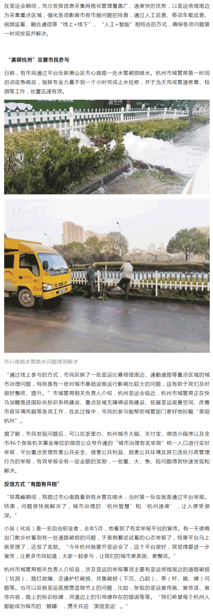 城市治理有獎(jiǎng)平臺(tái)是打造“一網(wǎng)統(tǒng)管”杭州模式的創(chuàng)新手段,創(chuàng)新了一條全民參與型的城市治理路徑,提升了政府利用數(shù)字化推進(jìn)城市治理的能力,該平臺(tái)成為社情民意多面、G效的收集和反饋渠道之一。