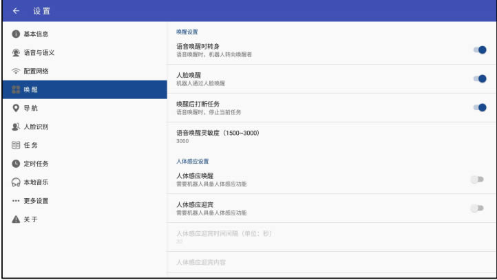 喚醒包含:人臉喚醒,語(yǔ)音喚醒,人體感應(yīng)喚醒。用戶可根據(jù)自己要求修改喚醒迎賓詞, 喚醒間隔時(shí)間