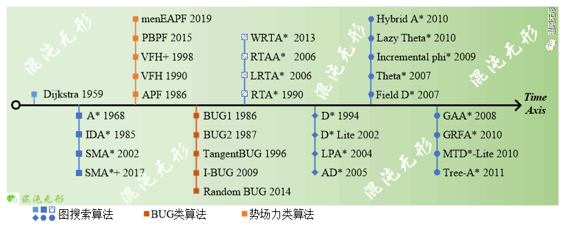 圖規(guī)劃算法根據(jù)路徑生成方式的不同分為三類(lèi),其中以圖搜索算法為主,以及BUG算法和勢(shì)場(chǎng)力算法。