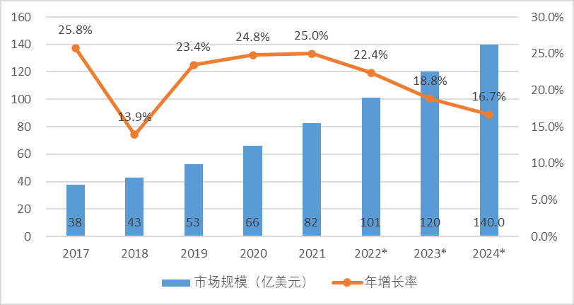 2017 年以來, 特種機器人產業規模年均增長率達到 21.7%, 預計 2022 年特種機器人市場規模超過 100 億美元, 2024 年特 種機器人市場規模將有望達到 140 億美元。
