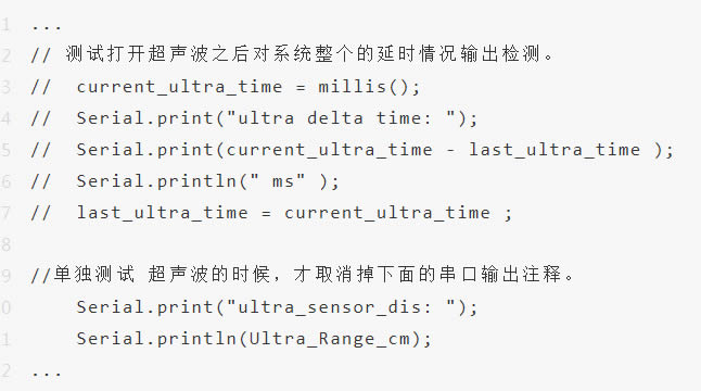 該程序定義了一個存儲測距信息的變量 Ultra_Range_cm , 測距范圍為“0-1m”。此時,我們可以看見下面有兩大段注釋。其中,D一段是用來測試整個系統功能執行一遍所需要的時間,若取消掉注釋,即可在 串口監視器 實時查看輸出的時間信息。